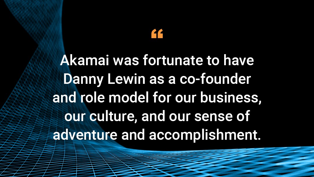 Akamai was fortunate to have Danny Lewin as a co-founder and role model for our business, our culture, and our sense of adventure and accomplishment. It was Danny who helped to instill the Big Idea that we would change the Internet, and it was Danny who relentlessly reminded us that we were always "behind"--his way of trying to drive everyone at Akamai to want to do better and to accomplish even more than we thought possible.
