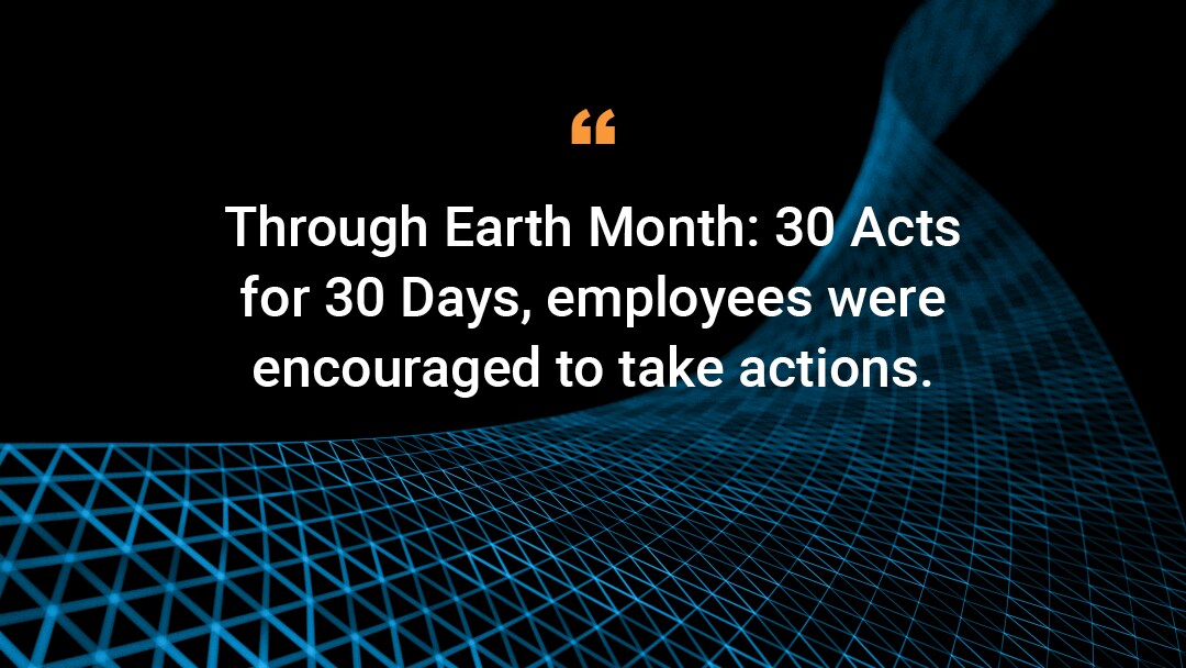 Through Earth Month: 30 Acts for 30 Days, employees were encouraged to take actions such as hugging a tree to celebrate their love of the planet, planting pollinating flowers, utilizing power strips to conserve energy, posting recipes for meatless meals, checking their tire pressure to increase gas mileage and produce fewer emissions, getting out into nature, upgrading to an energy-efficient appliance, upcycling (e.g., turning an old lampshade into a hanging planter), participating in low-waste efforts (e.g., repurposing a lemon as an herb pot after using it for cooking), and so much more!