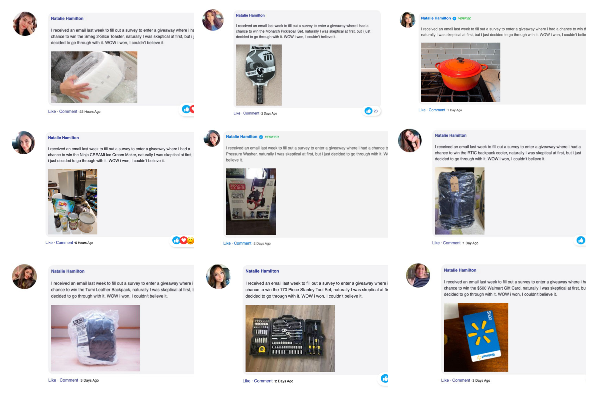 Natalie Hamilton continues to emerge in different shapes and forms. We were able to track her as a winner of many prizes in many campaigns as part of this continued scam (Figure 9). The scam’s longevity and the large number of brands it has abused indicates its depth. This scam is relevant to every company that is trying to protect their brand’s reputation.