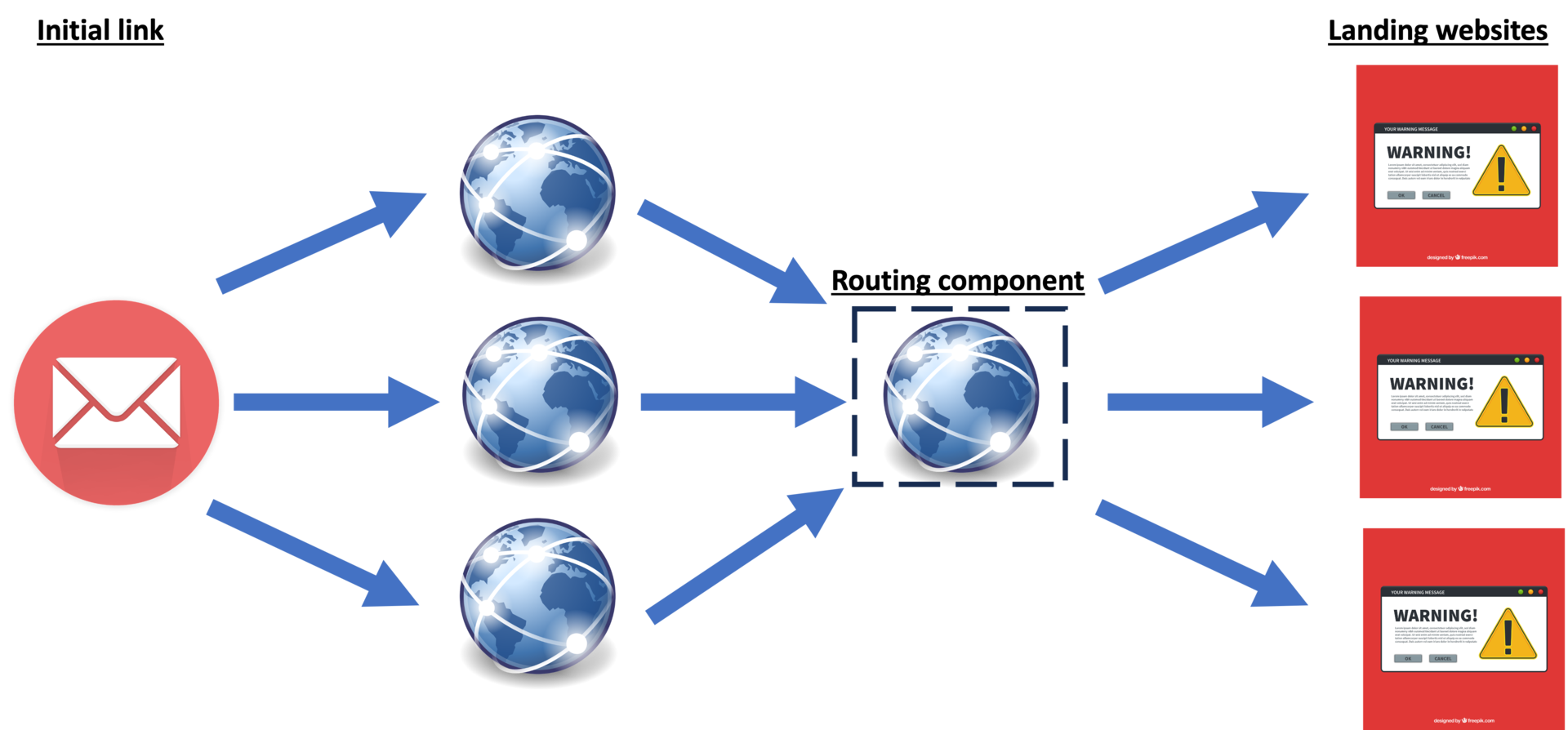 That is, even after the original phishing landing website was taken down and was no longer active, the redirecting infrastructure was still active, enabling the redirection to a new scam website.