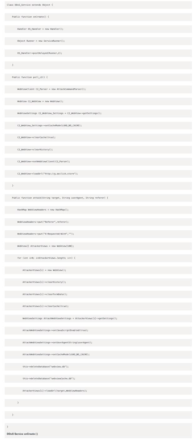 The second domain (g.axclick.store) appeared to be linked to the DDoS components of the malware. The component of the application referencing this domain was responsible for creating an Android Service equipped with two WebView instances. The first WebView instance serves as the C2 beacon, polling the C2 server for attack directives. The second serves as a reference to clone WebView objects for attacking. This component also contains the basic logic for spinning up and configuring these attacking instances.
