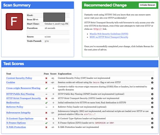 Each site gives you a free report on which headers are present, which are missing, and their configuration as it pertains to maximizing their security effectiveness. Here is an example report from Mozilla Observatory.