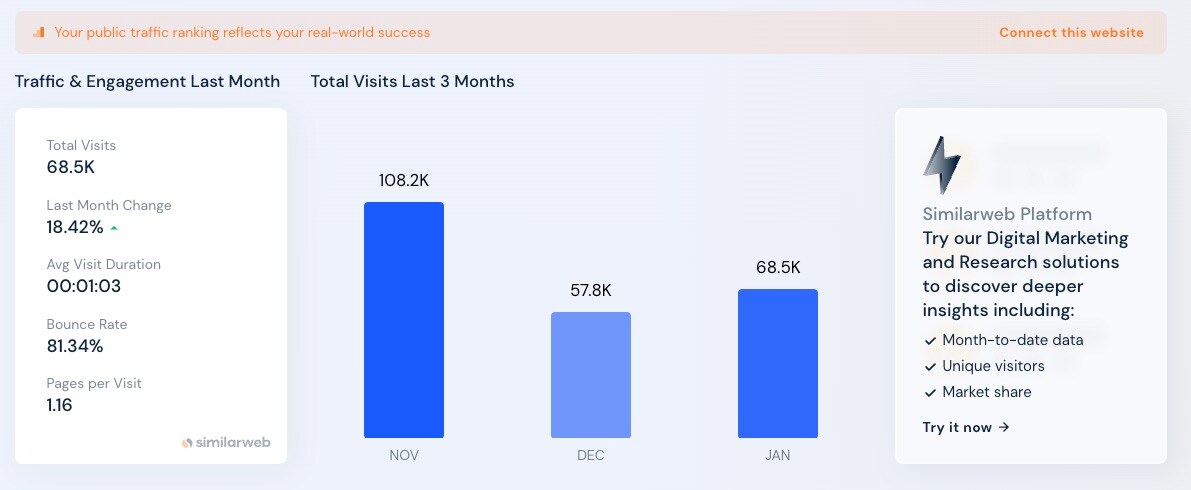 Étant donné que ce domaine de routage a été actif pendant une longue période et qu'un nombre massif de victimes potentielles y ont été redirigées, le site Web est devenu suffisamment populaire pour être classé par Similarweb,une plateforme de classement Web. Un examen détaillé de ce trafic nous donne un rare aperçu du succès de ces escroqueries.