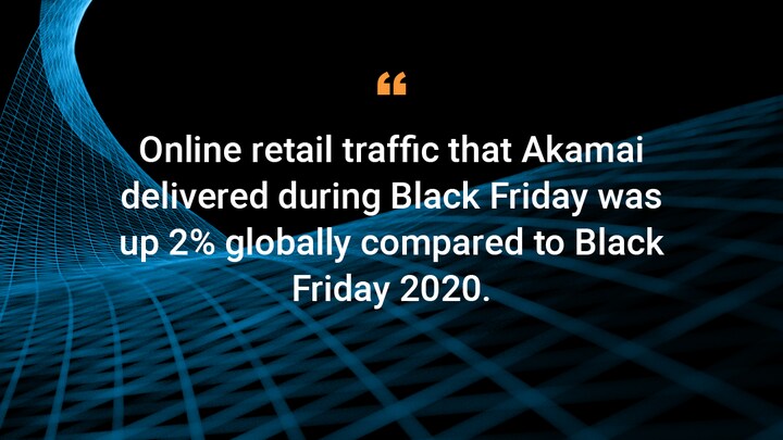 Akamai がブラックフライデー中に配信したオンライン小売業のトラフィックは、2020 年のブラックフライデーと比較して世界全体で 2% 増加、また金曜日の平均トラフィックと比較して世界全体で 14% 増加しました。前年比でのわずかな増加は、2020 年に、多くの買い物客を実店舗から遠ざけた COVID-19 関連のロックダウンと制限によってトラフィックが大幅に増加したことに起因している可能性があります。