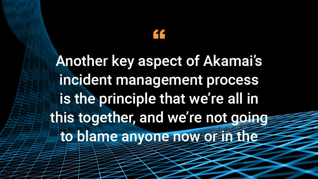 Outro aspecto fundamental do processo de gerenciamento de incidentes da Akamai é o princípio de que estamos todos juntos nisso e não vamos culpar ninguém agora ou no futuro. A equipe de incidentes trabalha em conjunto para resolver o problema, seja ele qual for, da melhor maneira possível, focando primeiro na redução do impacto, para depois descobrir como evitar que ele aconteça novamente. A Akamai se concentra em encontrar as suposições que levaram a um incidente, aprendendo com essas suposições incompletas e fazendo as modificações apropriadas para reduzir as chances de que eventos semelhantes ocorram novamente.