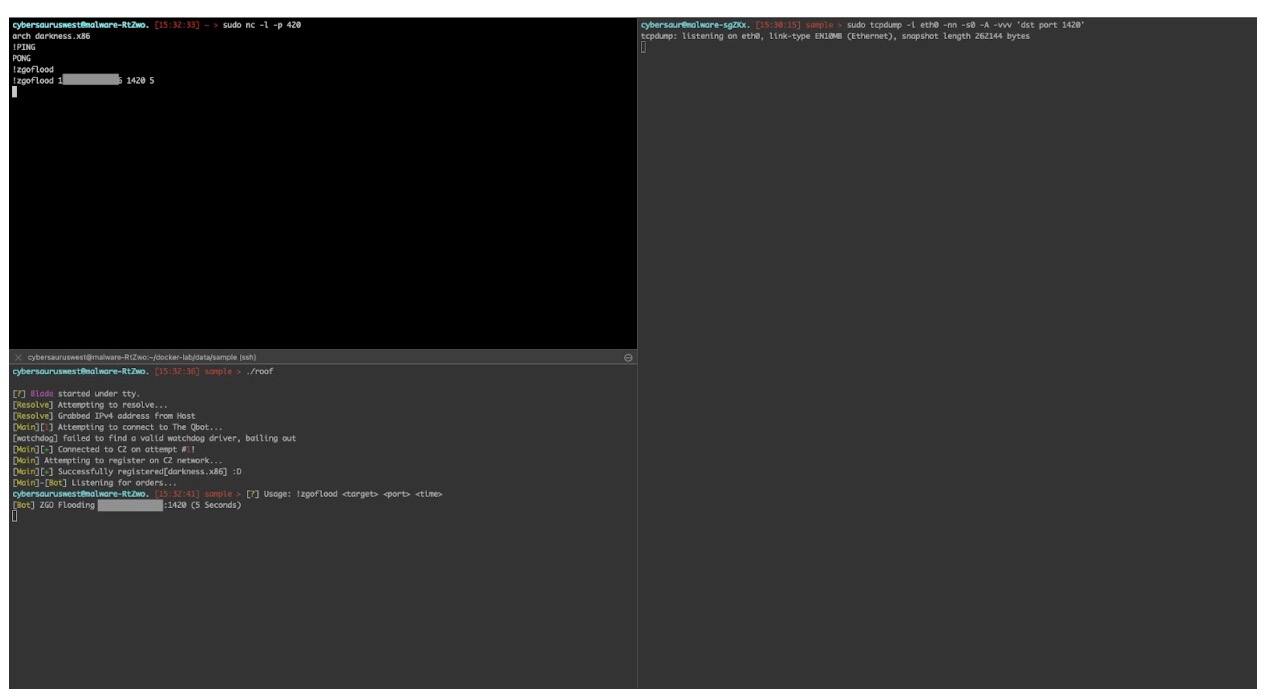 Por meio da engenharia reversa e da correção no binário do malware, nossa análise determinou o potencial de ataque do botnet em aproximadamente 629,28 Gbps com seus ataques de inundação UDP.